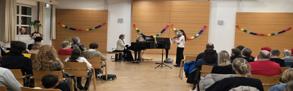Nachbericht zum Faschingskonzert der Musikschule Aystetten am 12. Februar 2026 stellten sich im bunt geschmückten Bürgersaal zahlreiche Besucher ein, einige dem Anlass entsprechend kostümiert.